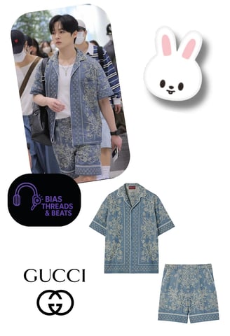 As the official global ambassador for Gucci, Lee Know arrived at Incheon International Airport wearing a standout piece from the luxury brand: the Gucci GG washed denim jacquard shirt and matching shorts combo. The all-over monogram set struck the perfect balance between laid-back and luxe - ideal for long-haul travel while still serving major style.